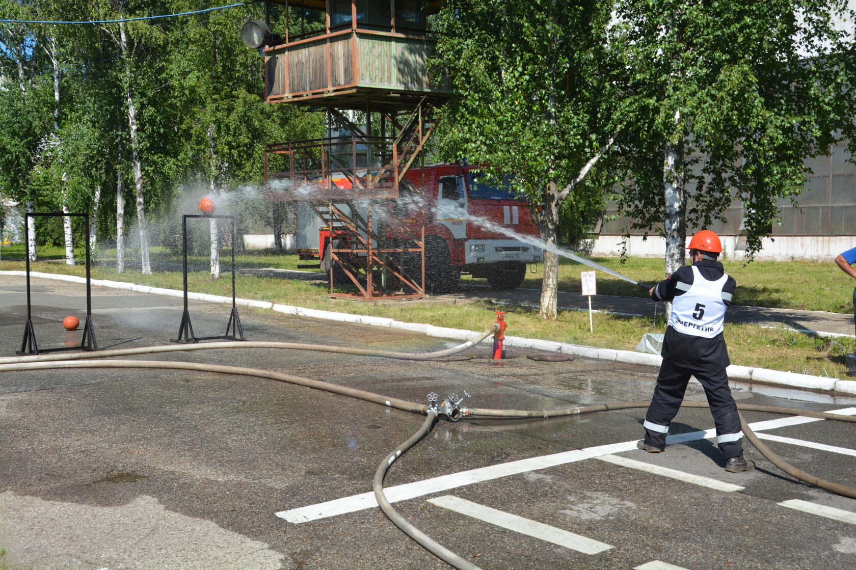 На первом этапе участники бежали с полными ведрами воды, далее имитировали звонок в пожарную службу.